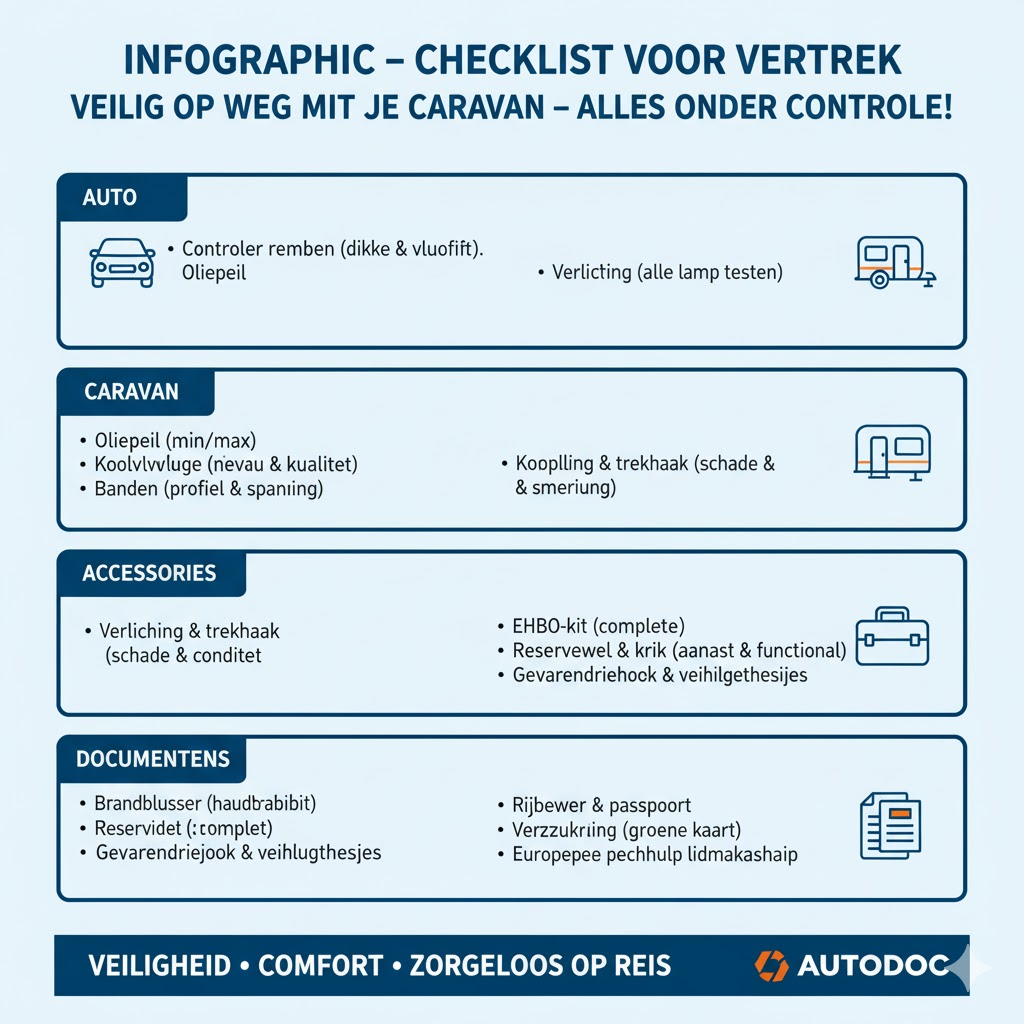 Een gedegen technische controle vooraf vermindert het risico op pech aanzienlijk. Volgens pechhulpdiensten is het risico op motorproblemen, oververhitting of remstoringen voor voertuigen die een caravan trekken in de zomermaanden ongeveer 40% hoger dan voor solo-rijdende auto’s. De hoge belasting en temperaturen maken de controle van koelvloeistof, oliepeil en remblokken essentieel.